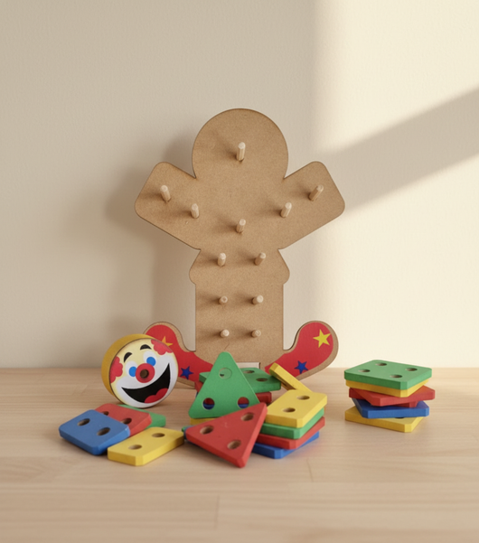 Feito em madeira resistente e pintura atóxica, é um brinquedo seguro, durável e perfeito para as mãos curiosas das crianças. Cada peça tem uma forma geométrica diferente, estimulando o reconhecimento de figuras, cores e posições de forma envolvente e interativa.